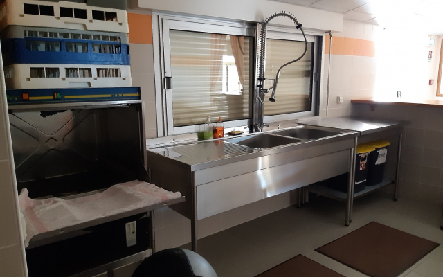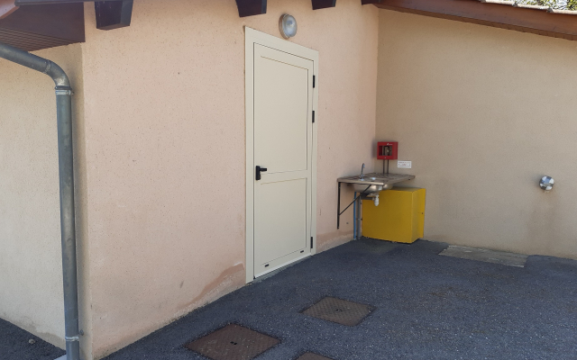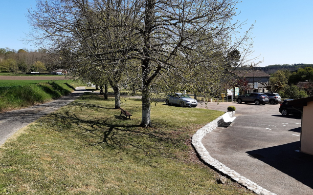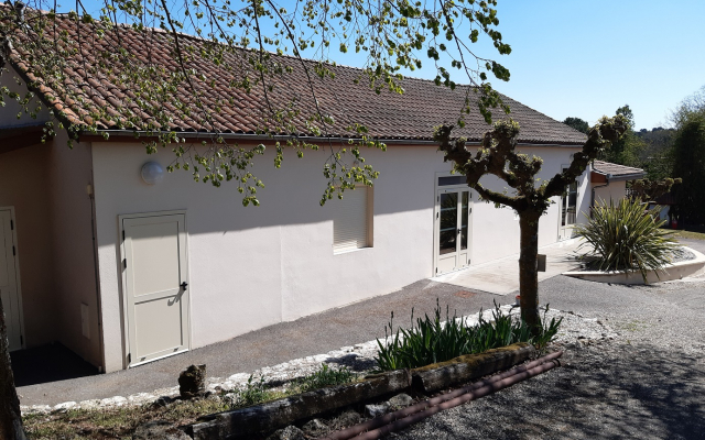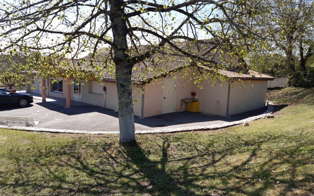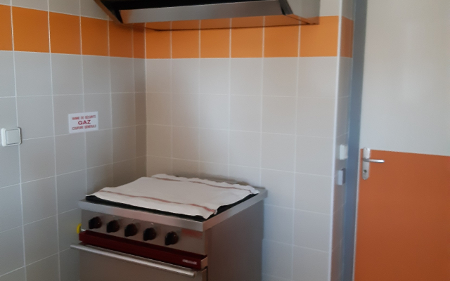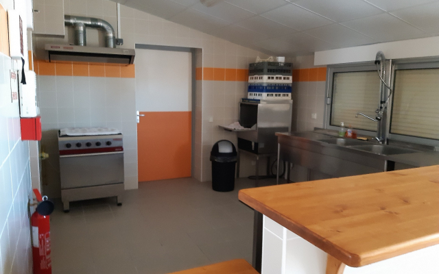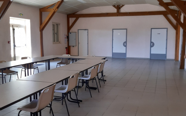 Il y a un parking devant avec un espace enherbé et arboré. Un muret en pierre sécurise l’espace. Elle est équipée d’une cuisine et d’une arrière cuisine qui ouvre sur l’extérieur, d’une réserve de rangement des chaises et tables. Elle a été rénovée en 2020 et est donc aux normes d’hygiène et de sécurité les plus récentes.